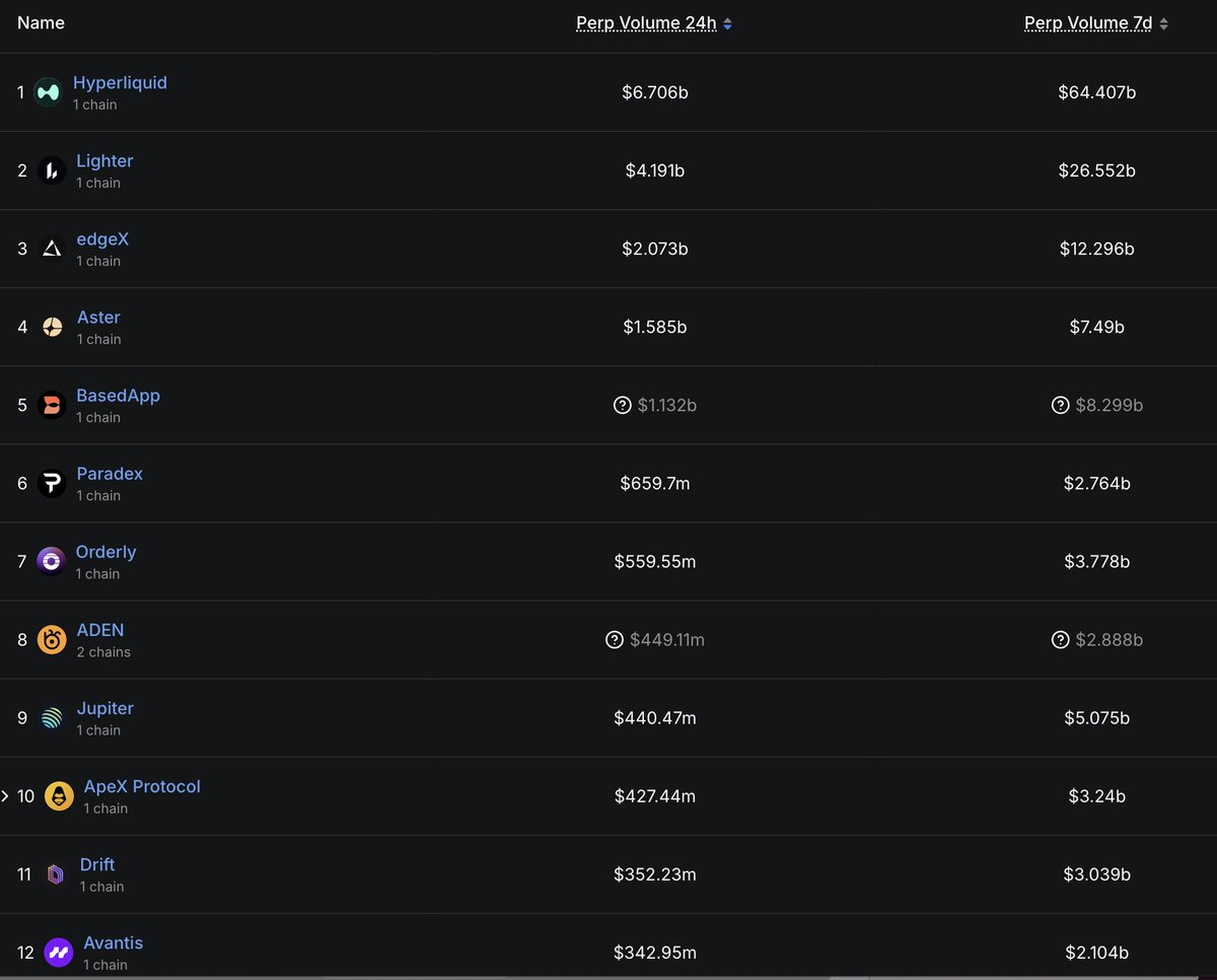 很明显已经发币的交易量变化不大甚至还跌了,包括龙头 Hyperliquid。数据量飙升的则是正在拉盘的 Aster 以及快要发币的 EdgeX 和 Lighter,洗刷刷洗刷刷……(来源)