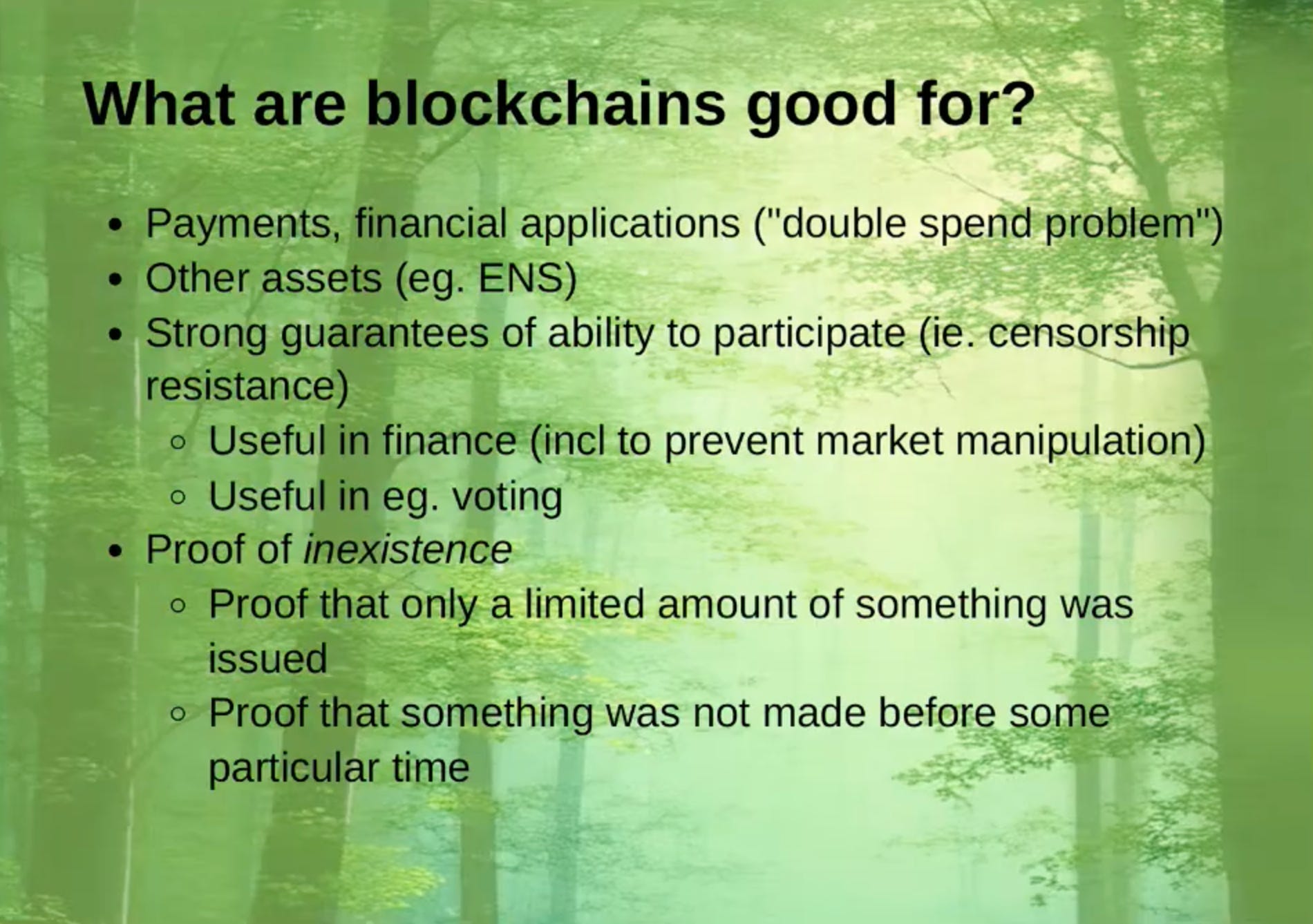 区块链提供了强大的参与保证,也叫抗审查性(censorship resistance)。它有力地保证,如果你发送了一笔有效的交易(即遵守协议规则),它将被(且很快被)打包。这在金融领域(防止市场操纵)等很多方面都很有价值。