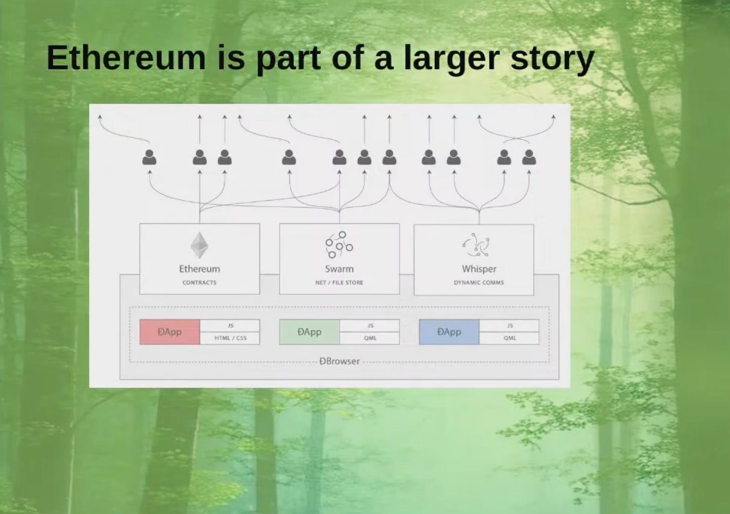 以太坊是更大故事的一部分。这张图来自 Gavin Wood 在 2015 年的构想,即 Web3 的早期愿景:以太坊是一套技术中的一员,它们共同创造一个更自由、更开放的互联网。