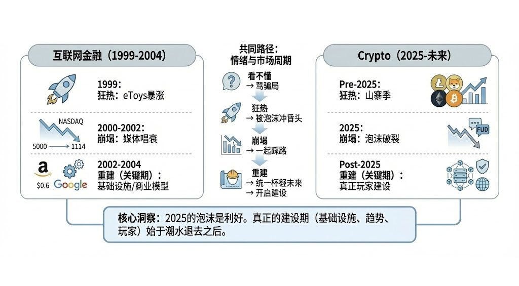 如果你觉得 crypto 波动戏剧化,那只是因为你忘记了互联网的前半生。1999 年,只要名字里有 .com,就能融资。eToys 上市首日暴涨 900%,投资人疯狂得像 Crypto 早期的山寨季。然后泡沫破裂。纳斯达克从 5000 多点掉到 1114 点;媒体封面写着互联网骗局;所有人都说互联网完蛋了。那段情绪几乎和今天 crypto 一模一样:看不懂的人骂骗局;看得懂的人也被泡沫冲昏头;最后一起踩踏;然后大家统一怀疑未来本身。但讽刺的是 —— 真正的互联网时代,是从泡沫破裂的那一刻开始的。当潮水退去,不仅仅知道谁在裸泳。还帮我们筛选出了最有可能游到对岸的真正选手。2002 年,亚马逊股价只有 0.6 美元。Google 还没上市。那些被留下来的公司,在最不被看见的几年里,反而把真正的基础设施、商业模型、盈利方式统统建了起来。Crypto 现在最像的,就是当时的 2002–2004:不是最热的年份,却是最关键的年份。泡沫破裂把噪音清掉了,趋势、方向、基础设施、真正的玩家才开始进入建设期。