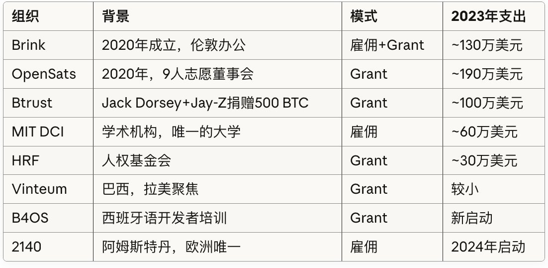Aaron Zhang:2023 年,全球用于 Bitcoin Core 开发的资金总额是 840 万美元。同一时期对比:Polkadot 虽然市值只有比特币的 1%,却在协议开发上花了差不多的钱;以太坊基金会 2023 年核心开发支出约 3200 万美元;而市值相近的 Meta 雇佣了 2 万名工程师。比特币呢?41 个活跃 Core Dev,5 个 Maintainer。谁在出钱?目前活跃的比特币核心开发赞助机构共有 13 个,分为两类:私人资助型(5 个)与依赖捐赠型(8 个)。数据来源为 1A1z 报告,基于公开财务披露、典型 Grant 规模与员工数量估算。其中,雇佣 vs Grant 是一个关键区分:只有 6 个组织提供正式雇佣(稳定工资、福利、长期合同),其余都是 Grant 模式,本质上是每年重新申请一次工作。报告中的一位受访开发者原话说:这就像每年要重新面试才能保住饭碗。报告中最让我震惊的发现是,一个人几乎撑起了半边天:Jack Dorsey 的资金版图遍布整个生态。OpenSats:90.5% 的资金来自 Dorsey 的 #startsmall;Brink:14.2% 的捐款来自 Dorsey;Btrust:100% 由 Dorsey 与 Jay-Z 捐赠;Spiral:Block 的子公司,Dorsey 为 Block 联创;MIT DCI 也接受过他的捐赠。