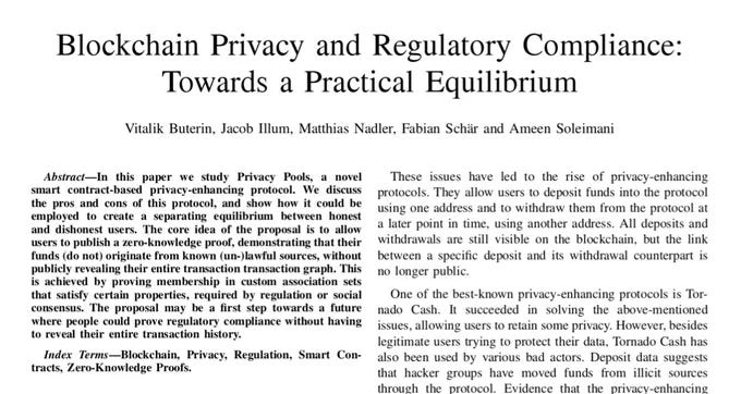导读:昨天 Vitalik 和巴塞尔大学的一些学者们联合发表了一篇论文,在推特上引起了广泛关注。该论文提出的 Privacy Pools 协议为实现隐私与合规的兼容提供了一个可行的技术方案。深潮研究院对该论文进行了解读和精炼,并试图通过通俗的语言阐释论文的核心要点,以帮助更多人理解隐私和合规这个重要议题。