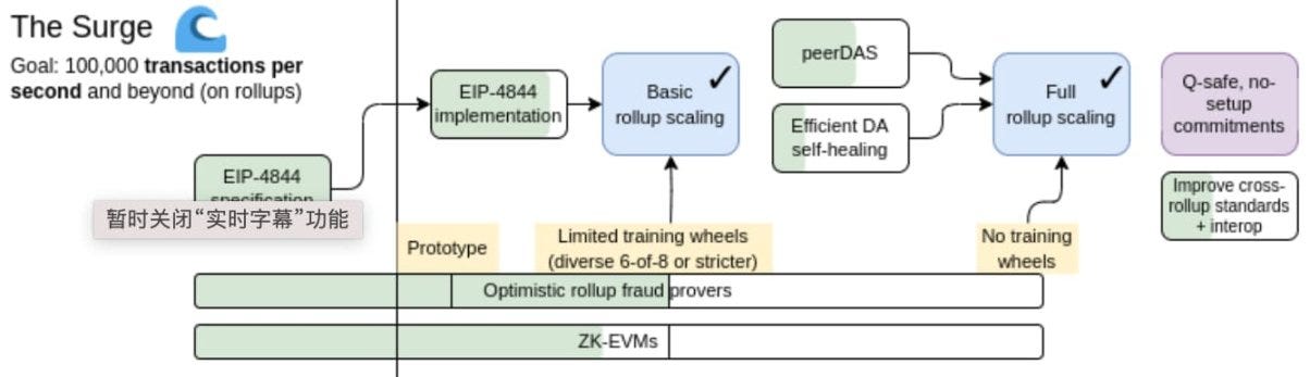 Vitalik Buterin: The Surge 关键目标:1)未来以太坊通过 L2 可以达到 10 万以上的 TPS;2)保持 L1 的去中心化和鲁棒性;3)至少一些 L2 完全继承了以太坊的核心属性(去信任、开放、抗审查);4)以太坊应该感觉像一个统一的生态系统,而不是 34 个不同的区块链。