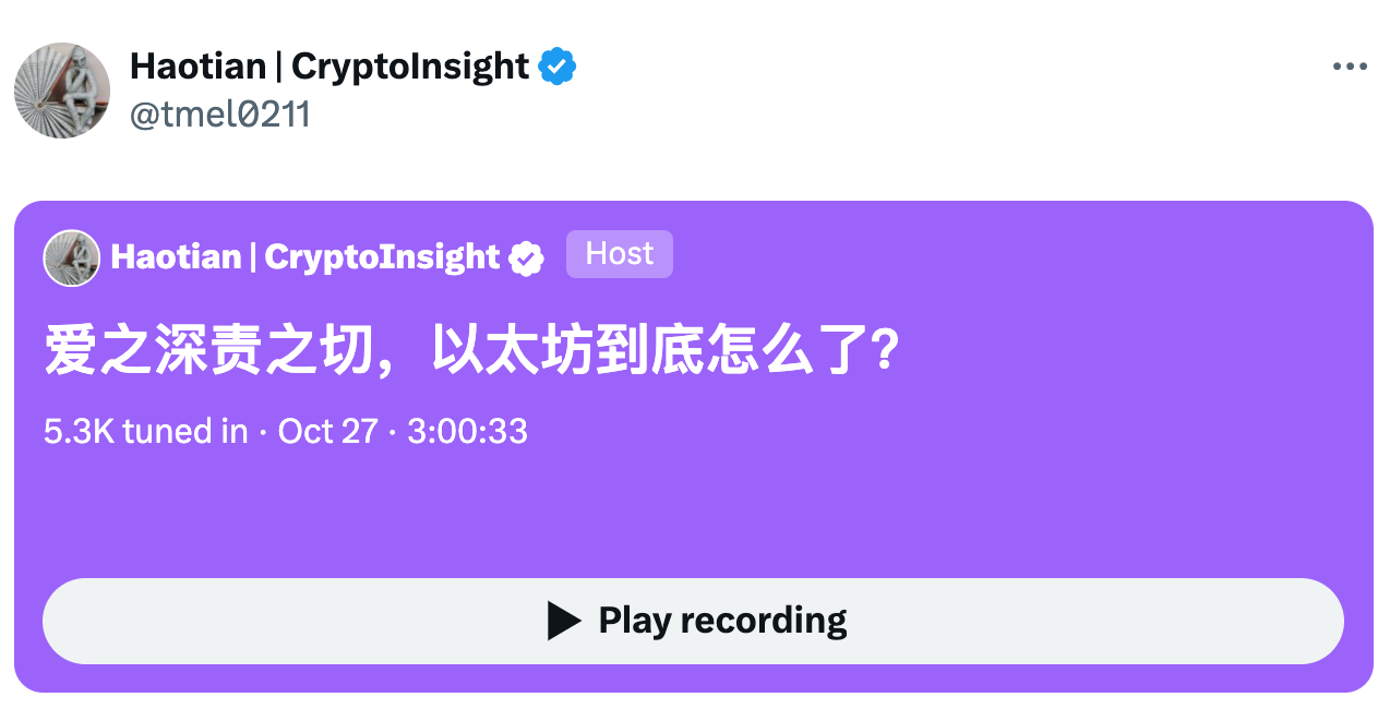 导读:在最近举办的主题为「爱之深责之切,以太坊到底怎么了」的 Space 中,几位投研博主从过去、现实以太坊存在的问题切入,围绕以太坊进行了系统讨论。加密研究员 AmyWang 撰文分享其听后感。