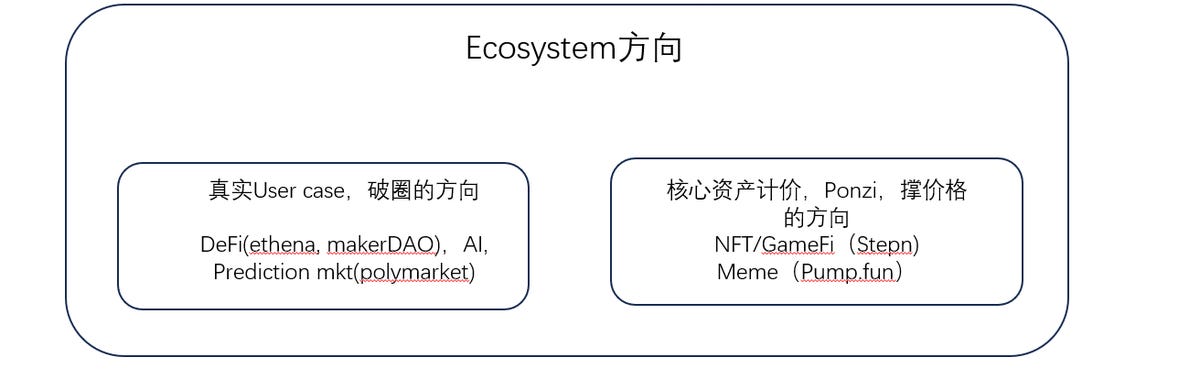 生态的土狗币资产定价其实是公链生态发展好坏的结果。20-21 年,以太坊靠 DeFi/NFT 两个生态让所有 DeFi 资产和 NFT 资产都用 E 定价。不管从实质的买盘,还是从虚的心理定价,都会把币本位作为最后的定价标准。近期 Solana 做最对的,我觉得就是 pump.fun 不断用发新土狗的三盘理论拆分盘以及极少量用户的造富神话,来给整个市场吸引大量买盘。久而久之,用户心理就会形成以 SOL 定价土狗资产的模式。