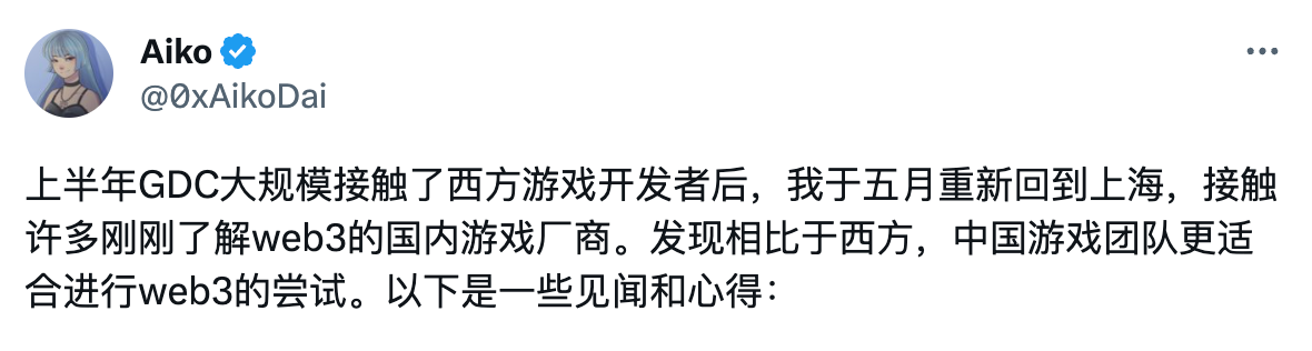 导读:Folius Ventures 研究员 Aiko 上半年于 GDC 大规模接触了西方游戏开发者,近期接触了许多刚刚了解 web3 的国内游戏厂商,认为相比于西方,中国游戏团队更适合进行 web3 的尝试。