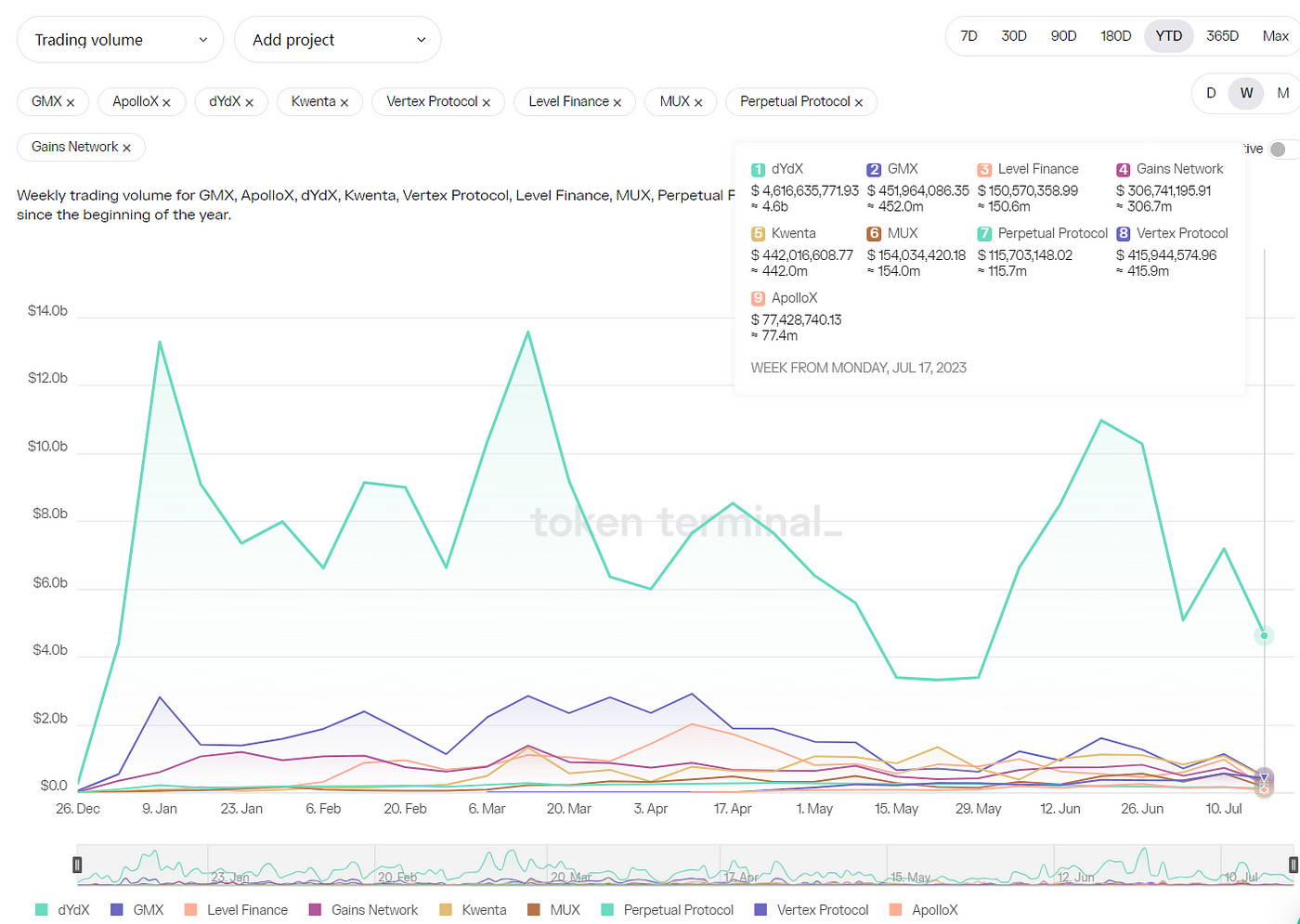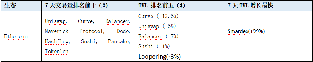 DEX:Dex combined TVL 14.7 billion, 较上周减少 0.5bln。Dex 24 小时交易量 1.12 billion, 7 天交易量 19.3biliion, 较上周增加 2.1billion。衍生品 DEX:衍生品 DEX 的整体交易量较此前一周出现下跌。9 个主要衍生品 DEX 协议的周交易量约为 74 亿美元,而此前一周的周交易量约为 124 亿美元,跌幅 40%。( 来源 )