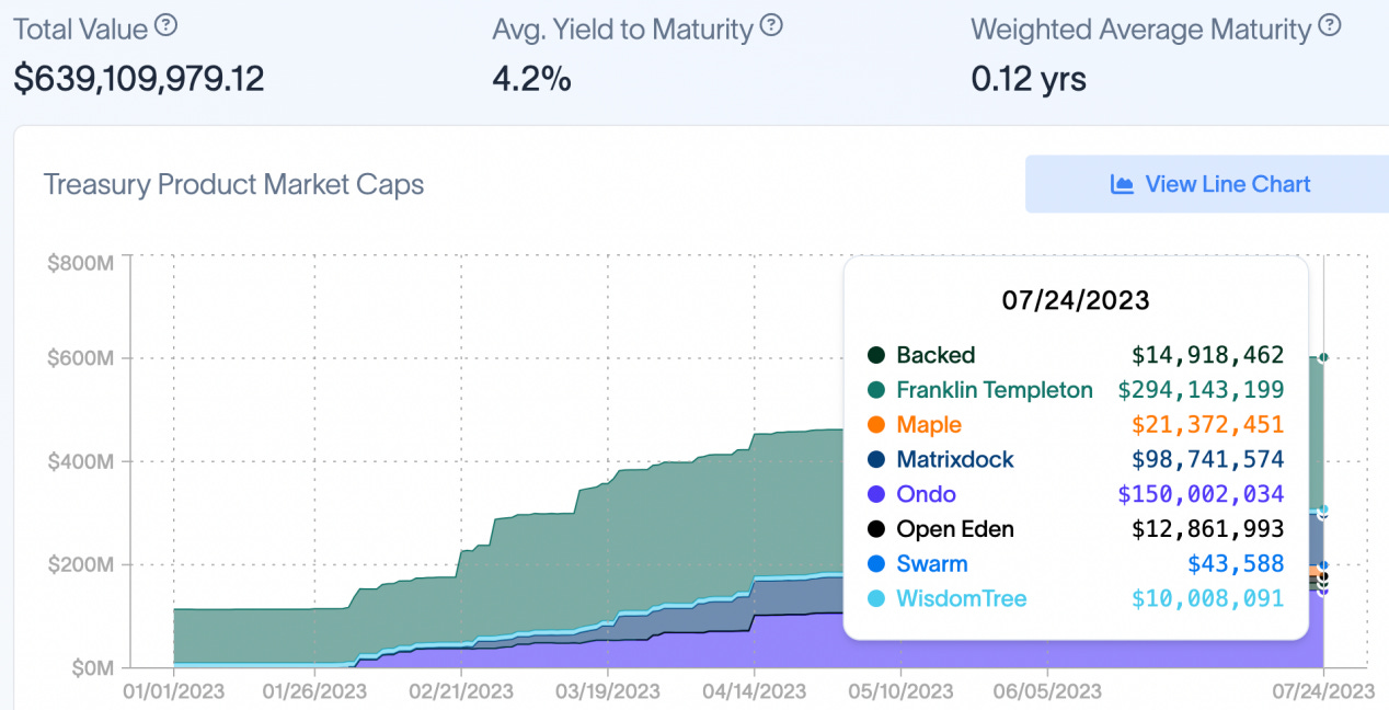 以太坊 L2:Layer2 TVL 总量较上周减少 2.3 亿美元,总锁仓金额 99.4 亿美元。Zksync era TVL 连续第三周出现下滑,跌幅 17.86%,Starknet TVL 持续第二周上涨超过 30%。RWA:截至 7 月 24 日美债代币化总额达到 6.39 亿美元(不包含 MakerDao 购买美债业务),较一周前约减少 100 万美元。Maker 是目前 RWA 赛道的绝对龙头,业务总规模已经达到 33.8 亿美元。