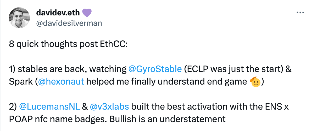 davidev.eth: 1)稳定币重回市场,Gyroscope 及 Spark 值得关注;2)以太坊 L1 不会垄断 EVM 的定义,L2 正在准备用更多功能扩展 EVM(EIP-7212),希望看到在 Polygon、Arbitrum、Optimism 的共同努力下,将 EVM 推向对终端用户更友好的方向;3)没有人在构建类似 Interop 的东西。如果执行得当,扩展格局将会改变;4)Lens 是唯一在台上谈论 ERC-6551 的项目,但这将是 NFT 的下一个重大解锁场景;【原文为英文】