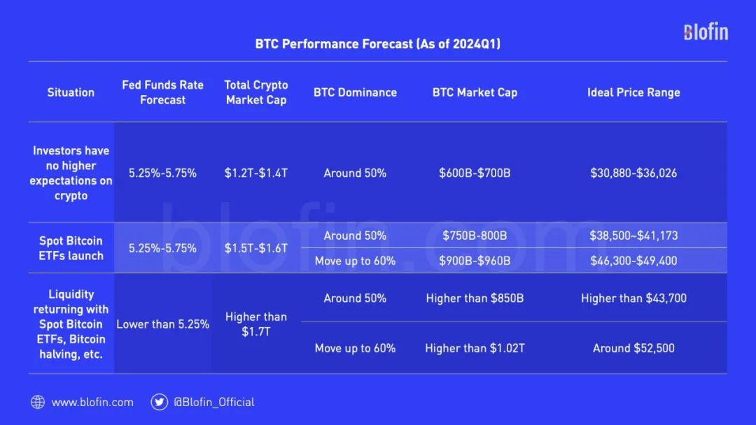 简单考虑三种情况:1)投资者没有更多预期,加密市场内部市值增长有限。加密市场的总市值将会稳定在 1.2 万亿 - 1.4 万亿美元之间,BTC 的市占率不会出现太大改变,这意味着 BTC 的市值将在 6,000-7,000 亿美元间波动,价格将在 30,880-36,026 美元间波动;2)BTC 现货 ETF 通过,为投资者带来良好预期。加密市场的市值反弹至 1.5 万亿 - 1.6 万亿美元左右;3)降息预期与现货 ETF、比特币减半等利好预期叠加,推动加密市场内流动性全面回归,加密市场市值反弹至 1.7 万亿美元以上。( 来源 )