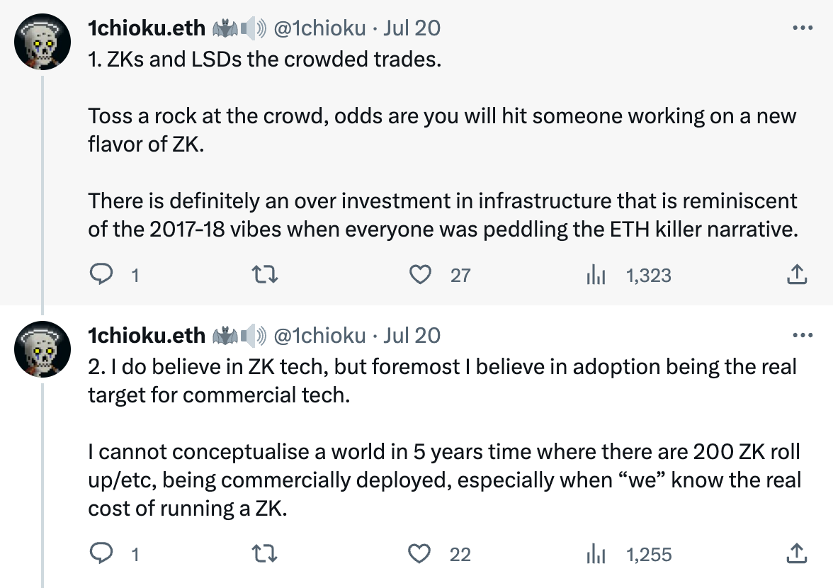 1chioku.eth: 1)ZK 和 LSD 在基础设施方面肯定存在过度投资,让人联想到 2017 年至 18 年的氛围,每个人都在讨论「ETH 杀手」;2)虽然我相信 ZK 技术,但我更相信技术的真正目标是采用。我无法想象 5 年后的世界里有 200 个 ZK Rollup 等待被商业化部署,尤其是我们知道运行一个 ZK 的实际成本时;3)很多风投都在以疯狂的估值大量投资基础设施项目,主要原因是短期内没有什么项目可以吸收这么多资金,其次是他们将自己与长期结果捆绑;4)LSD 似乎被过度投资,过去一年里市场动荡不安,CeFi 违约、CEX 欺诈及 DeFi 黑客攻击不断,资金自然会渗回给具备安全感的最后一个收益堡垒;【原文为英文】