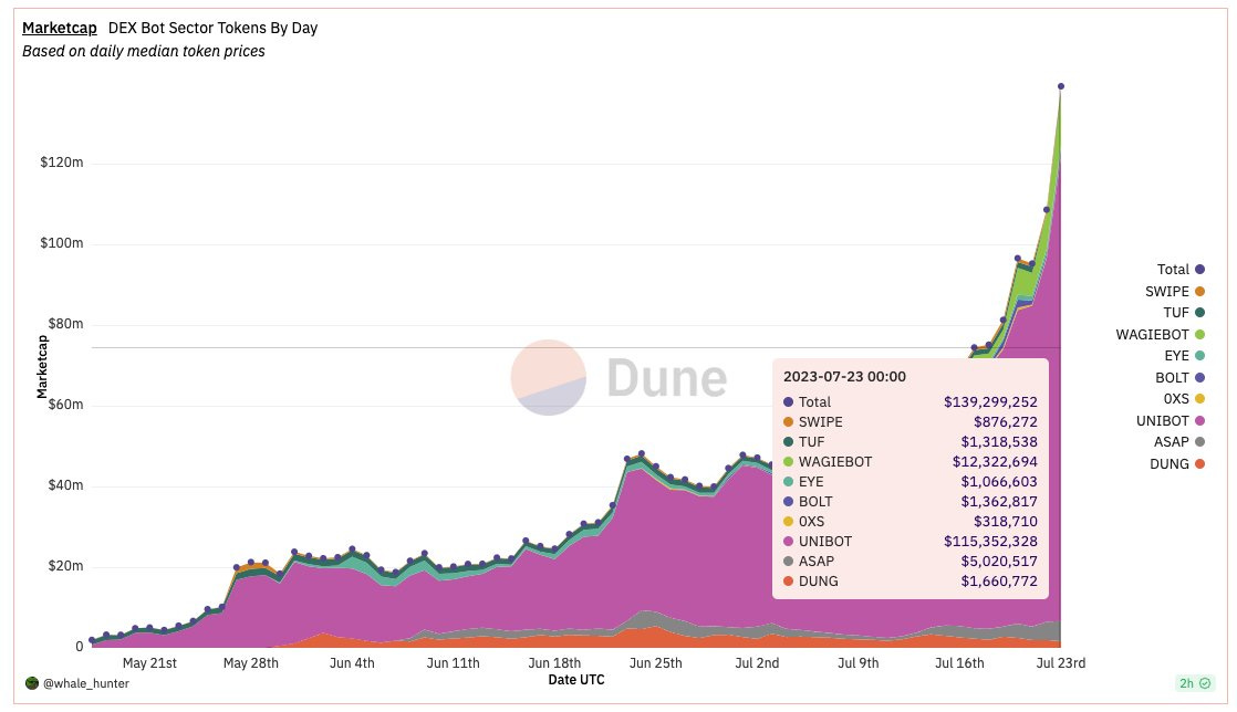 2lambroz.eth: Telegram Bots(电报机器人)代币是在电报上提供各种交易工具的机器人,在输入你的助记词后为你执行一些操作。 $Unibot 目前为龙头, 1.39 亿市值,其他代币在 5 百万以下市值,不包 $WAGIEBOT 1.2 千万市值。这些代币中的大多数通过 电报或 discord 提供各种功能,收入分享给代币持有者,因此是「真实收益」。功能通常为:通过电报进行交易;dex 狙击;复制交易;分析;空投农业。