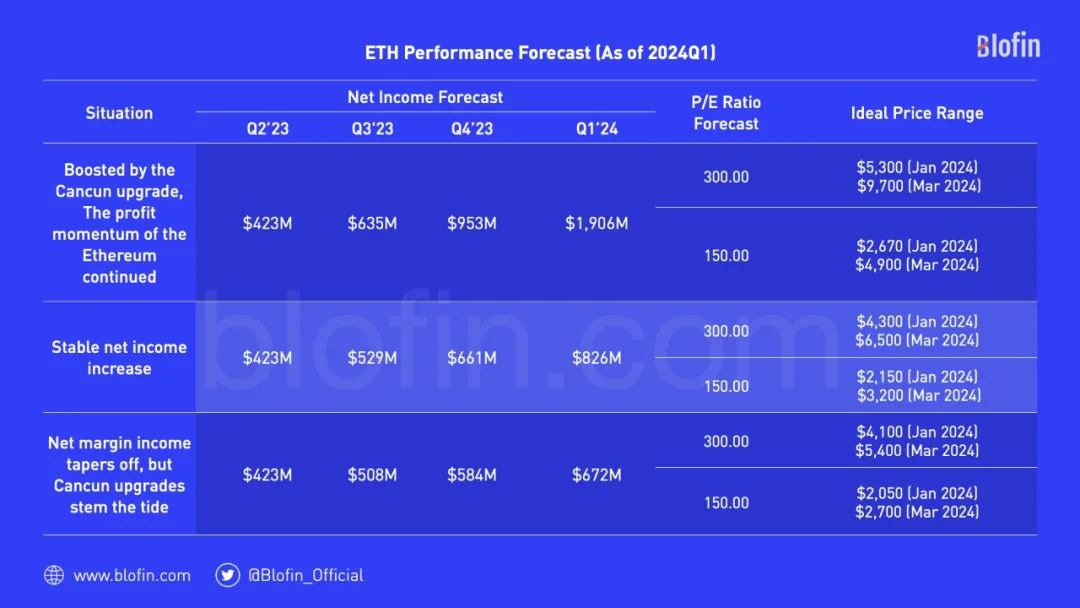 2)以太坊网络盈利相对稳健,每季度收入上升 25%,坎昆升级后第一季度收入相较 2023 Q4 上升 50%。如果市盈率回落至 150 左右,则 ETH 在 2024 年年初均价或为 2,150 美元左右,并于 2024 年第一季度突破 3,200 美元;3)以太坊网络盈利出现边际递减,Q3、Q4 的收入上升幅度分别为 20%、15%,坎昆升级带来的利好只是在第一季度遏制了盈利边际递减趋势。如果市盈率回落至 150 左右,则 ETH 在 2024 年年初均价或为 2,050 美元左右,并于 2024 年第一季度突破 2,700 美元。( 来源 )