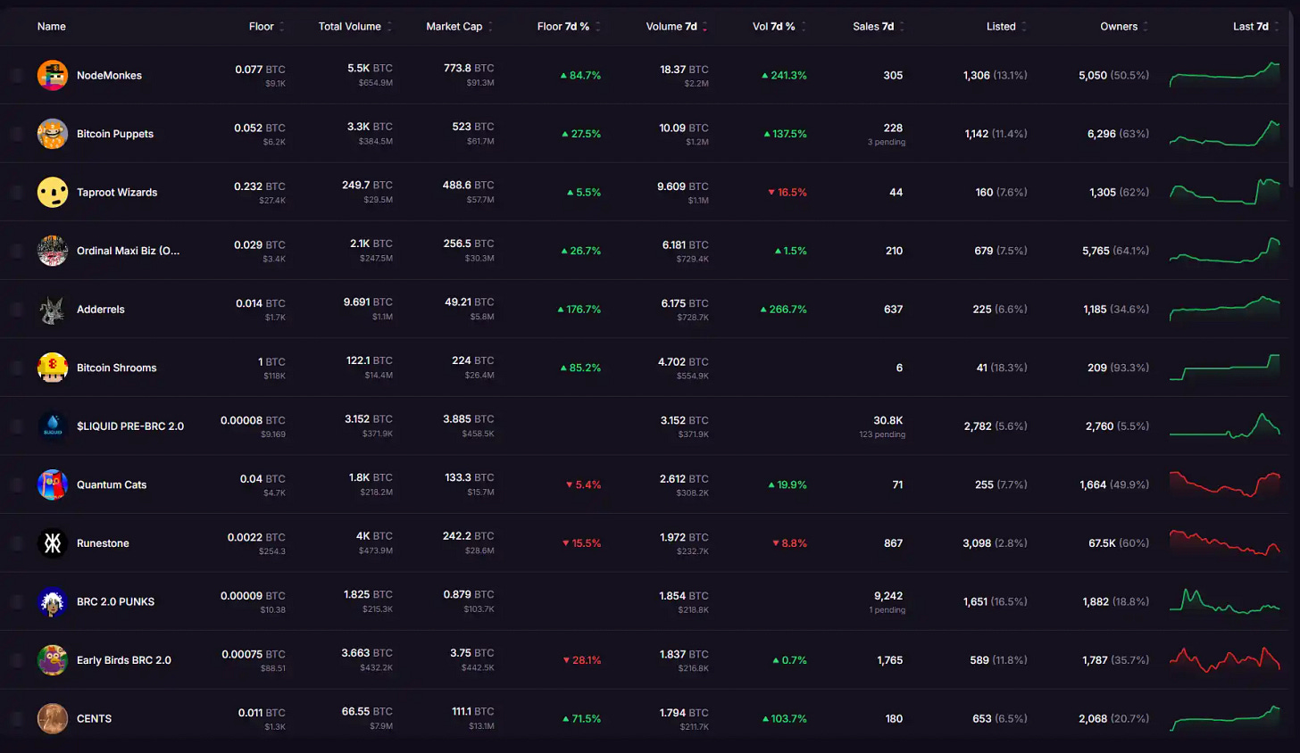 除了新兴的 BRC 2.0 项目,比特币生态内的老牌 NFT 项目也在近期有所表现。其中 NodeMonkes 过去一周上涨近 80%,成交量达到 18.5 BTC(约合 220 万美元),即便没有重大利好,仅凭 7 月 25 日宣布将推出零费用交易市场的消息便激活市场热度。Bitcoin Puppets、Taproot Wizards 和 OMB 这三大项目也维持了主导地位,显示老项目仍具强大号召力。艺术类项目如 CENTS 同样表现出色,在过去 7 日内上涨 70%,成交量达 1.8 BTC(约合 22 万美元),再次站上 0.01 BTC 的价格线,逐步稳固其作为比特币艺术 NFT 龙头的地位。尽管其艺术家 Rutherford Chang 于今年 2 月离世,但其理念已在比特币链上获得永恒传承。此外,符文生态也逐步走出低谷。虽然短期内 $DOG 出现回调,但在 Kraken 上架后获得 C2 Blockchain 大量增持,成为资金关注焦点。整个生态的积极信号显示出,比特币生态虽未回到巅峰,但正稳步恢复中,尤其在华语社区的推动下,仍保有强劲的生命力与影响力。( 来源)