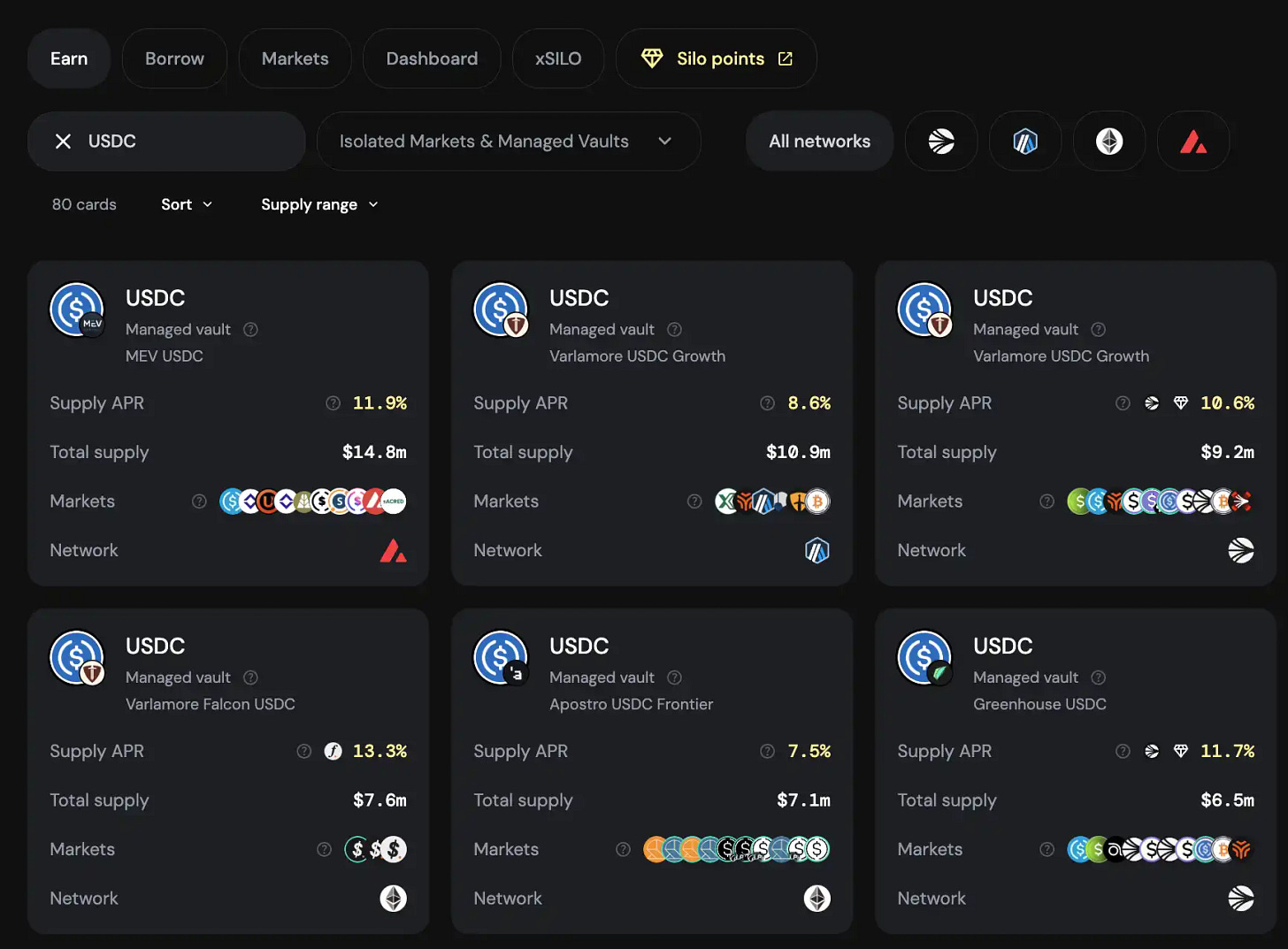 Silo Finance 是多链部署的非托管借贷平台,每个资产拥有独立的市场(Silo),实现互不干扰的清算机制。目前 TVL 达到 2.28 亿美元,覆盖 Arbitrum、Ethereum、Avalanche 等主流网络。用户通过 Managed Vault 存入 USDC 可获得 7%-13% 的年化收益,借贷结构清晰、风险独立。另一创新平台 Wildcat Labs 由英国团队创立,其架构同样为每市场隔离,且支持无抵押借贷。2025 年 8 月,由 Synthetix 创始人 Kain Warwick 支持的 Bodhi Ventures 开设了 USDC 市场,目标筹资 1000 万美元,固定 APR 为 16%。用户无需最低门槛,完成 OFAC 校验即可参与,并获得债务凭证 KAI2USDC,当前市场剩余可借额度为 780 万美元,赎回周期为 96 小时。两者分别代表了抵押型和无抵押型风险隔离借贷方向,为稳健收益型用户提供了更细分的策略选择。