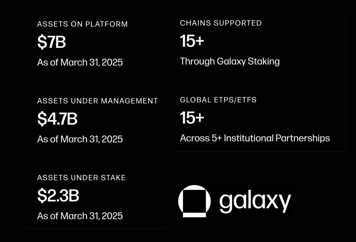 Ai 姨:Galaxy Digital 是 2017 年底成立的加密金融服务和资管公司,目前拥有五大业务线:交易、投资、资产管理、咨询和挖矿,被誉为「华尔街最懂加密货币的机构」。其中最核心的盈利部门是交易与投资业务,交易业务主要就是提供场外现货交易。这也是 Galaxy 近期最高频出现的角色定位了;场外业务合作方涵盖传统金融机构(如高盛、道富银行)、数字资产管理公司、托管与质押服务商(如 Fireblocks / BitGo)以及科技公司等。官网数据显示,目前平台资产规模达 70 亿美元,资管规模 47 亿美元,质押资产 23 亿美元,支持 15 条公链及网络,与 15 家 ETP 和 ETF 建立了合作。